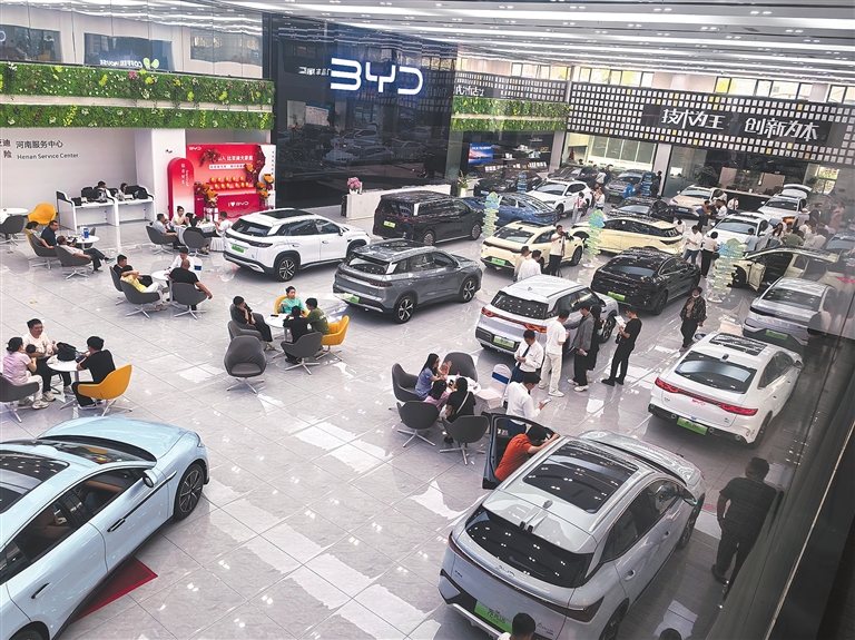 5月2日,在郑州比亚迪双网旗舰店销售大厅,前来看车、咨询的消费者络绎不绝。